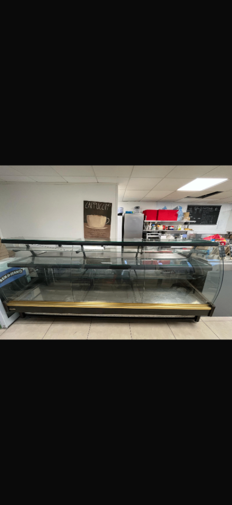 Large commercial refrigerated display counter (approx. 9ft 3”). • Fully working (holds temp around 1–2°C) • Curved glass front • Ideal for café, deli or takeaway • Good internal space • Used condition Only selling as no longer needed. Size: ap