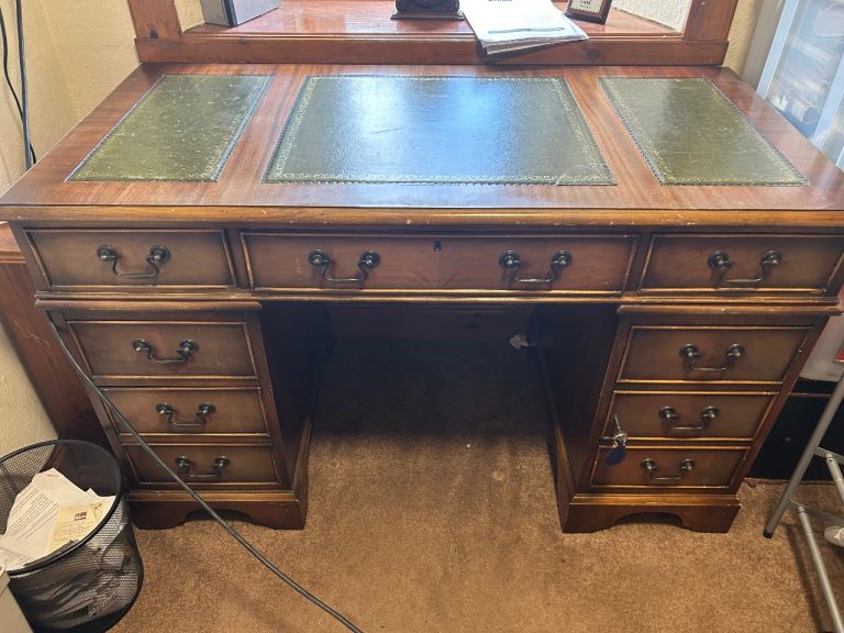 Green leather topped bankers desk with lockable drawers. Leather needs replaced. Can deliver.