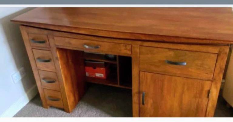 Wooden Office Desk, with drawers, cupboard and key board drawer. Including shelves in the foot weel Approx. Sizes - 1500mm Long x 830mm tall/high x 720mm width/depth. £25 ono Buyer to collect