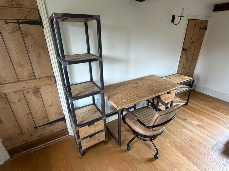 This furniture set is handmade from high quality steel box section and reclaimed wood, it was bought from Josef & Rosco Ltd at a cost of £1400 about 5 years ago. The chair is a Retro Industrial Mustang Chair which can be found on multiple websites f