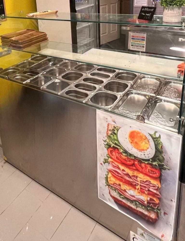 Cafe salad freezer/counter. Commercial stainless steel serve-over display fridge