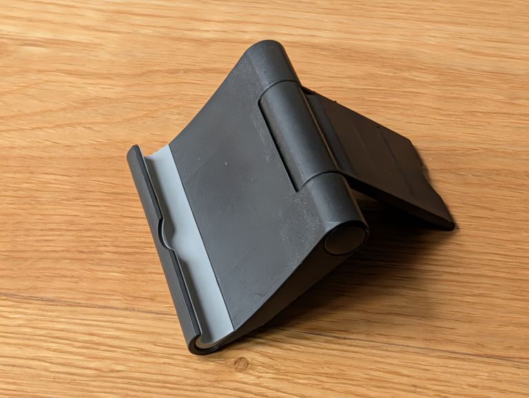 Enhance your desk setup with this practical and sturdy folding smartphone stand. Designed for versatility, this mount allows you to prop up your device for hands-free video calls, watching media, or keeping an eye on notifications while you work. Its