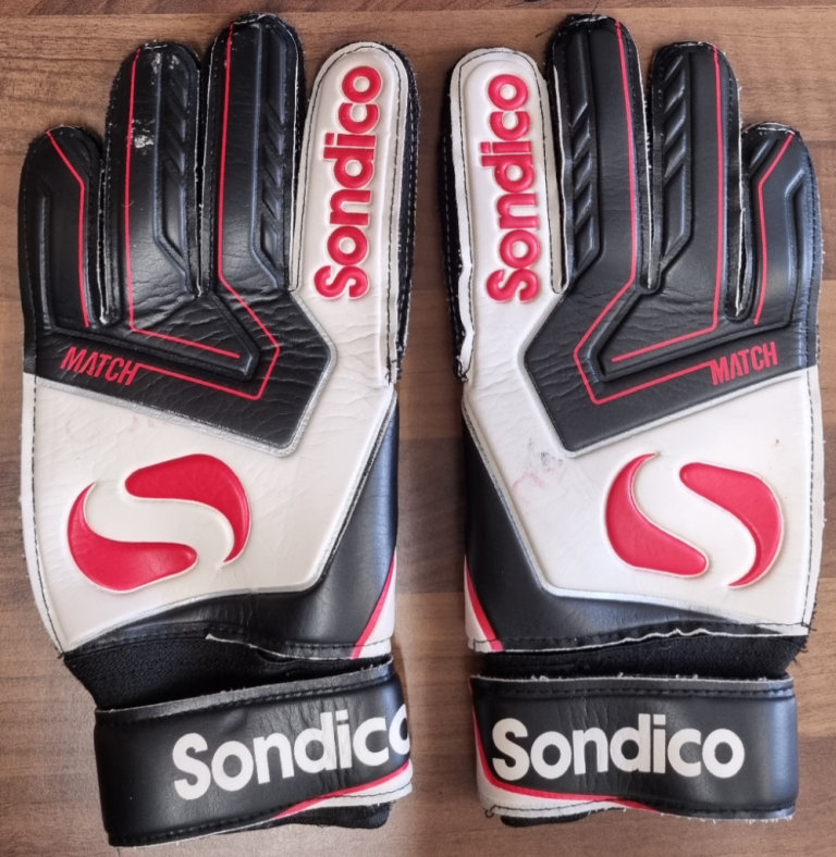Pair of Used Adult Sondico Pro Football Goalkeeper Gloves. Size 9 - White/Black Sondico Match Collection from Leeds LS2, near Uni of Leeds. Soccer Goalkeeping Goalie.
