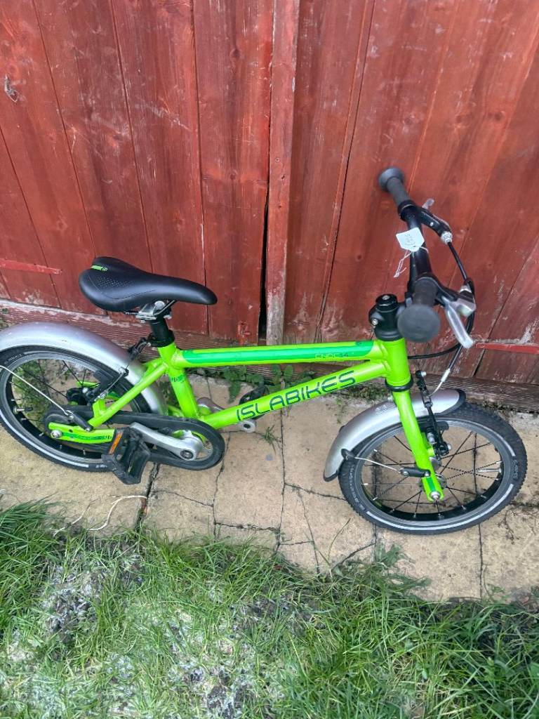 Islabikes Cnoc 14 Large - Age Use 3+ Green Colour with Added Mudguards. Minimum inside leg 38 cm and 98 cm in height. Could be resold relatively high after it is outgrown on your child, as these bikes keep their value well. It has some marks, althoug
