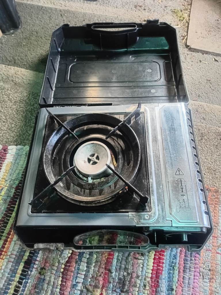Camping stove with carry box used condition but works well Needs gas £5.00