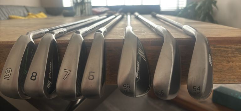 Ping Prodi G golf Clubs Irons 9 iron 8 iron 7 iron 6 iron Wedges 58 deg 56 deg 54 deg All right handed and has the free reshafting still to be used against them. Our son has now outgrown them and has new clubs. Happy to answe