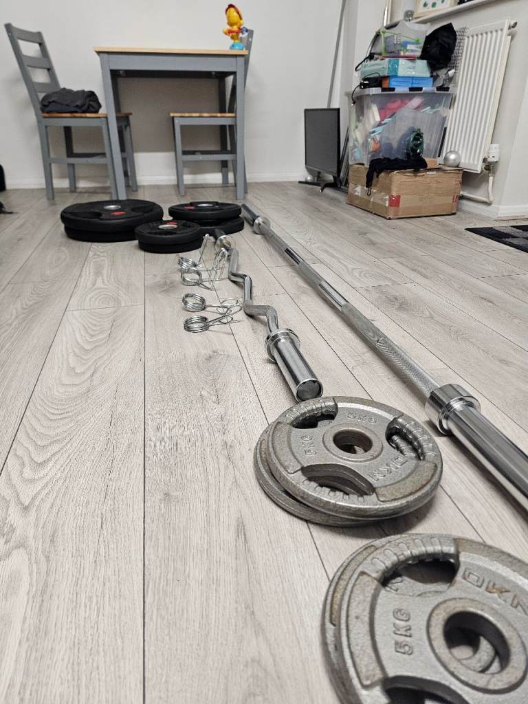 Selling my 7ft Olympic barbell (20kg) with an EZ curl bar, two pairs of clips, and a full set of plates: 2 × 20kg 2 × 10kg 6 × 5kg All plates are Olympic-sized (2” hole) and in great condition. Perfect for home or garage gyms — ideal fo