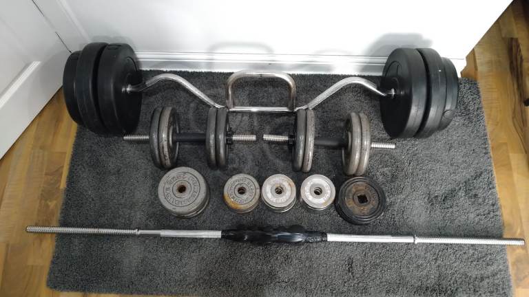 1 x 6ft bar, 1 multi grip bar, 2 dumbbell bars TNP Plates - 10kg x 4, 5kg x 2 Powerhouse - 5kg x 8, 2.5kg x 5, 1.25kg x 4 York - 1.25 kg x 8 Wieder - 2kg x 4 Bench
