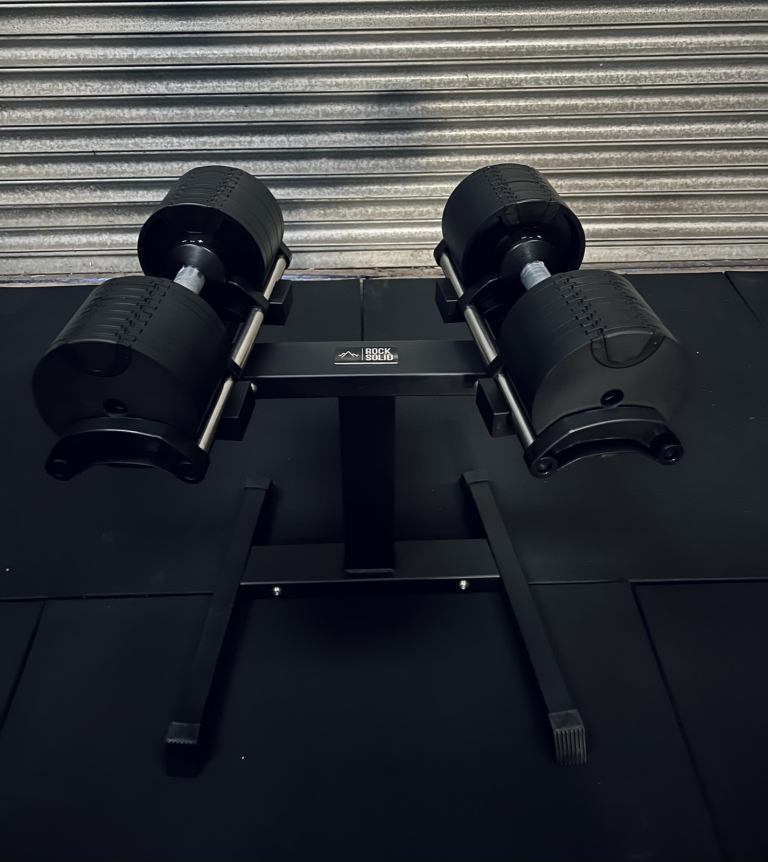 Brand new equipment still in boxes 2 x 32kg Adjustable Dumbbells 1 x Adjustable Dumbbell Stand Delivered UK and Ireland Order here or online at rocksolidfitness ie