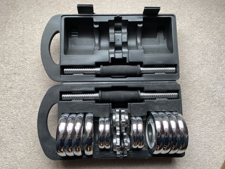 The York 20kg Cast Iron Dumbell set includes: - 2 x 14” chrome spinlock dumbell bars - 4 x chrome spinlock collars - 8 x 1.25kg cast iron weight plates - 4 x 0.5kg cast iron weight plates The spinlock design ensures the weights are safely secu