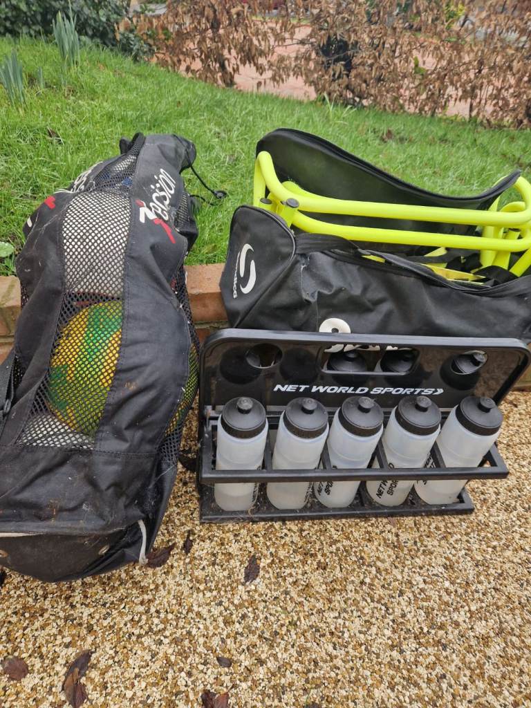 Pack of 3 size 5 footballs, water bottles and carrier and other bits from a disbanded football team