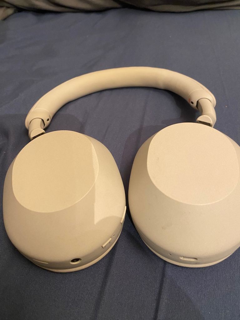 Sony wireless headphones (no case or charger(USB-C). Used but works perfect as new. There is a cosmetic discoloration on the fabric inside the ear cushions. They have been cleaned but the discoloration is still there. Other than that it is perfect in
