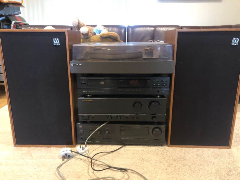 Full professional retro HiFi System. Trio KD-1033 Belt Drive Turntable (Lead patched - see image) Denon DCD-595 CD Player (no remote) Marantz PM30 Integrated Stereo Amplifier Dual CV 600RC Integrated Amplifier 2x Wharfedale Glendale XP2 Sp