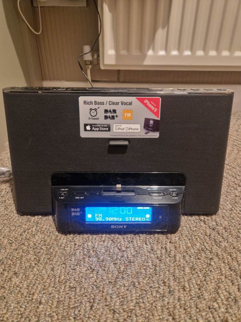 Sony docking station for iphone/ipod older gens looks brand new Remote still has the plastic tag in it has dab radio auxiliary cable slot Good condition Any more info call or txt thanks