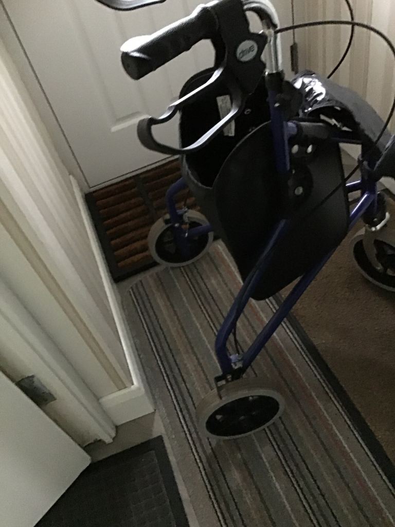 Three wheel rollater Blue and black , Small zipped bag very sturdy wheels and brakes folds for. Easy storage