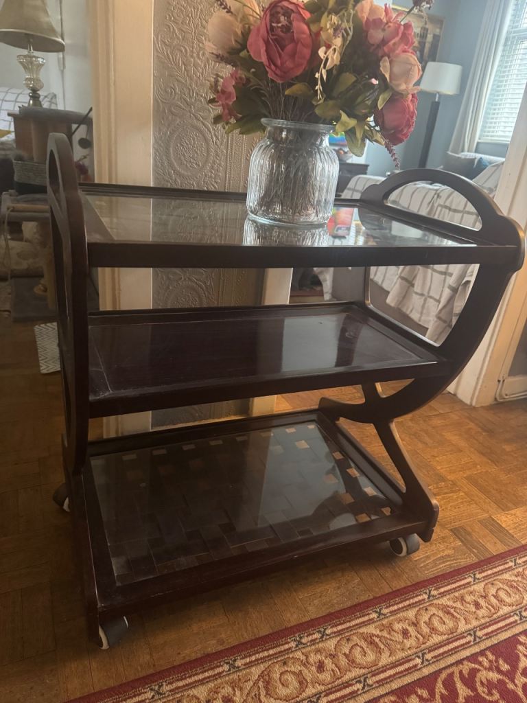 Indian, vintage, solid wood tea and drinks trolley with wheels, 3 tiered, beautiful design with inset glass on top and bottom shelves W 67cm x Depth 45cm x height 56cm approximately, £50, collection only
