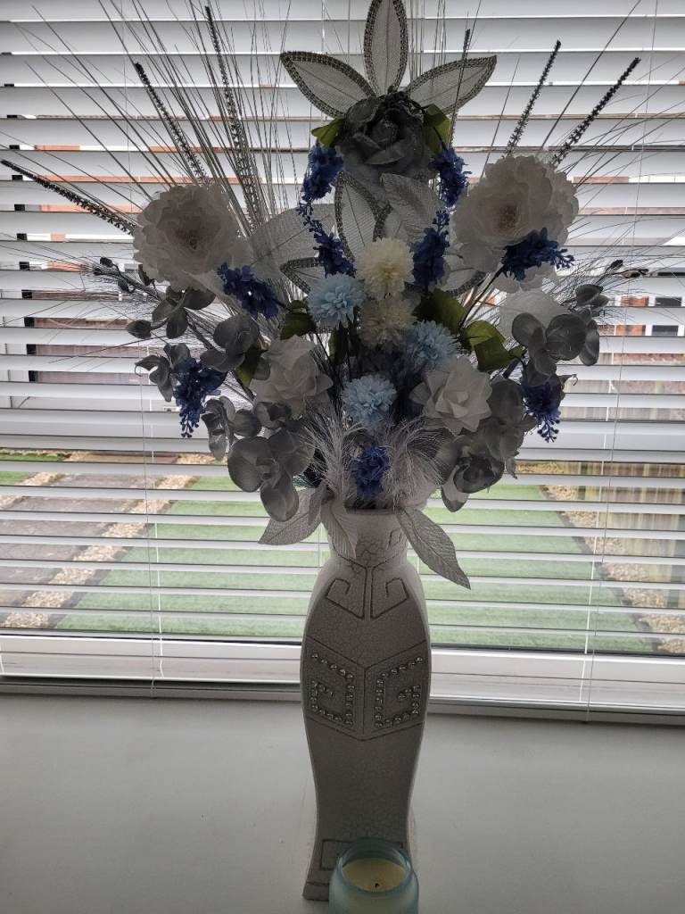 Beautiful silver and white vase filled with flowers.vase is 18 inches high,and with the fliwers 42 inches.£30 Pick up only