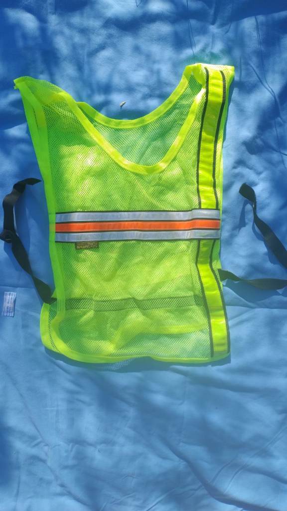 Unused fluorescent vest/bib for varying activities running, cycling walking or just leave in boot of car in emergency situations be seen