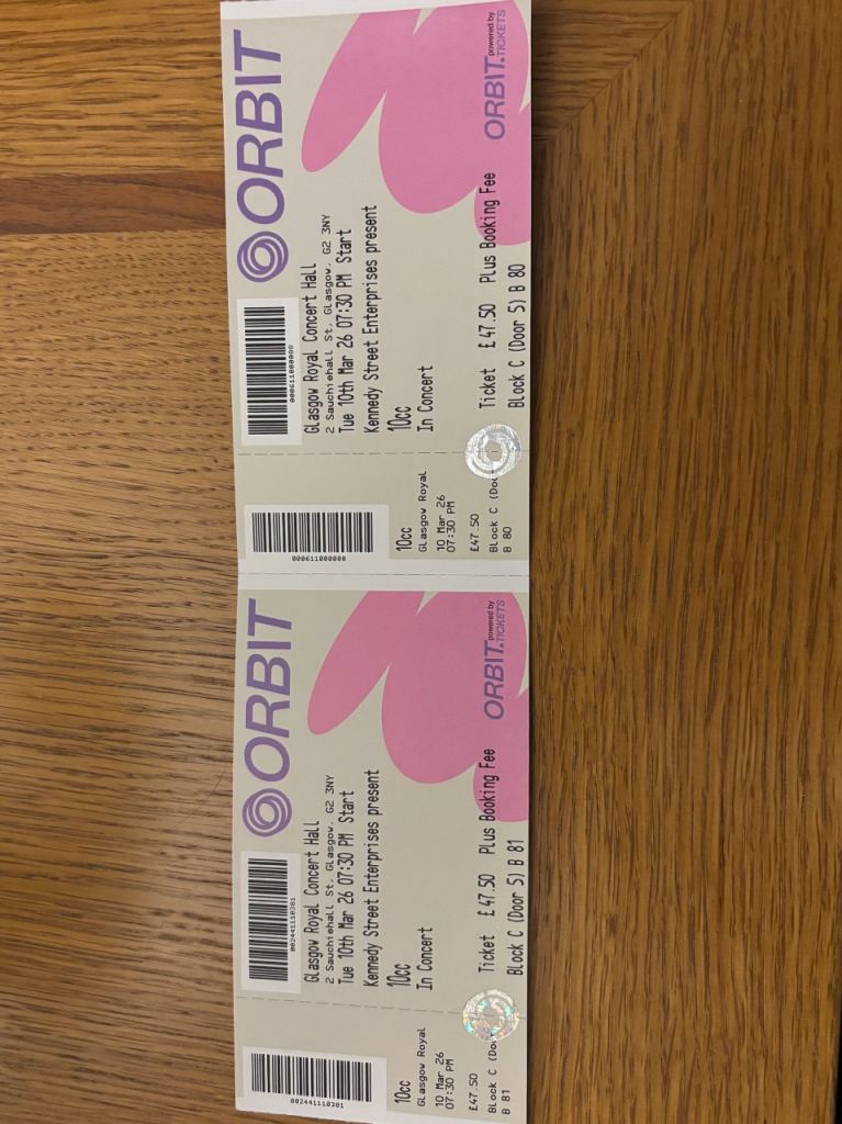 Two 10cc concert tickets - Glasgow Royal Concert Hall 10th March 2026