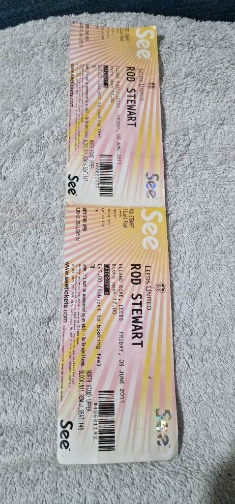 Unused in very good displayable/giftable/collectible condition. Full SEE Concert Tickets - Rod Stewart - Leeds Untied/Elland Rd - 3rd June 2011 - X2. Seating - NORTH STAND UPPER BLOCK:N11, ROW:J, SEATS:146 & 147. Has - Doors open 17:00, category 6 on