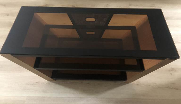 Ateca Vision Bordeaux BOR126WA LED, LCD, Plasma TV Wide Stand in a Dark Oak Finish with 3 Shelves Smoked Tempered Glass. Pre-Owned In IMMACULTE like new condition (No scratches, No sign or damage). Solid Wood and Glass TV Stand. Glasses are