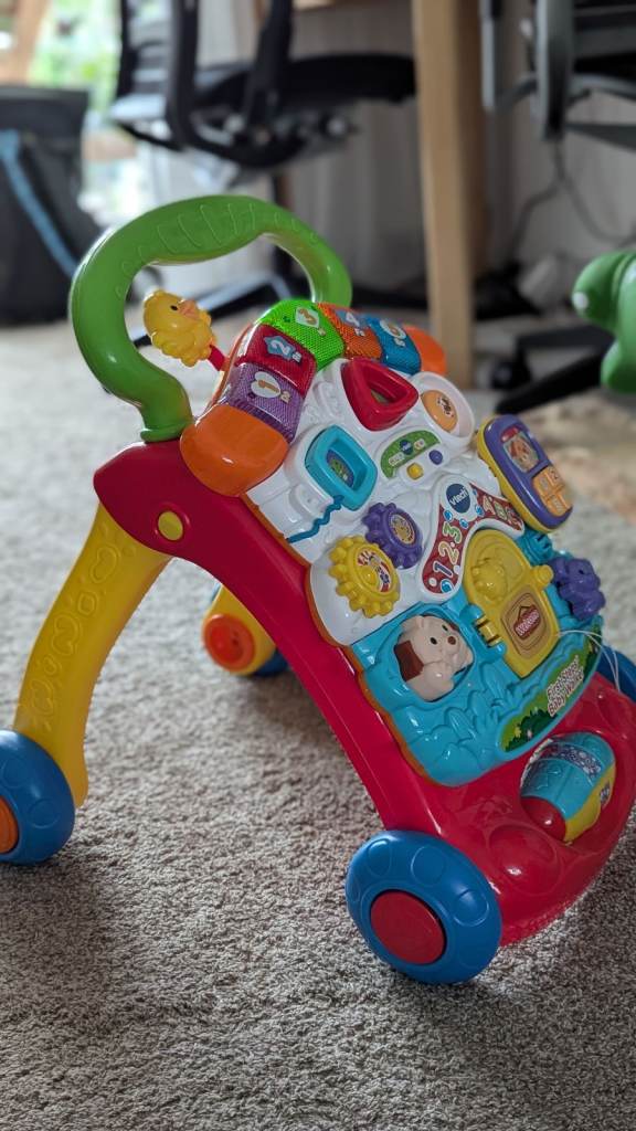 2-in-1 baby walker and activity centre Wide base and textured wheels Easy grip handle and durable design Activity panel with lights, gears and animal buttons Colourful shape sorter and role play phone Remove the panel from the walker for sit-dow