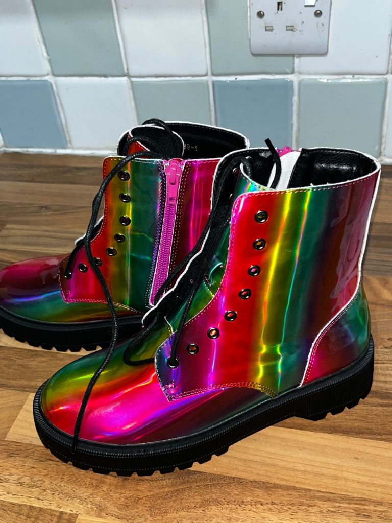 Only worn around the house for a few hours as, although labelled as UK size 7 these are more like 6 1/2. The pictures form part of the description. Note that the box is not what they belong in but is being used to keep them safe for delivery. As the