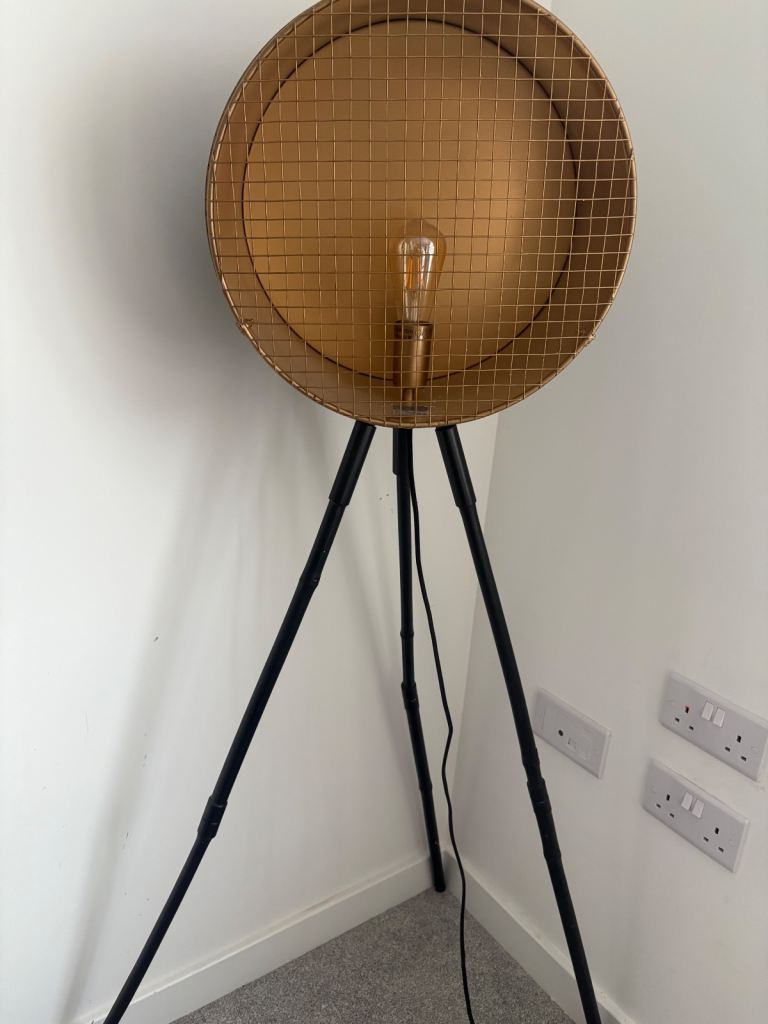 Black and gold/brass industrial style tripod floor lamp 141cm tall 21cm wide drum