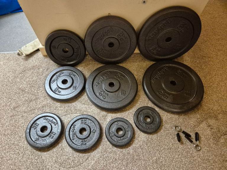 BodyMax cast iron one inch weight plates: 2 X 15 kg 2 X 10 kg 2 X 5 kg 2 X 2.5 kg 2 X 1.25 kg Includes spring clips