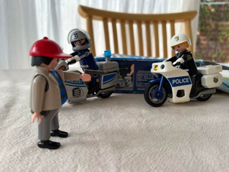 Playmobil Motorcycle Police Toys 2 bikes, one with flashing light. " police figures with helmets. One "baddie" with a gun! This toy is from the Romsey Area Toy Library, and though popular with many of our members, following our move to smaller pr