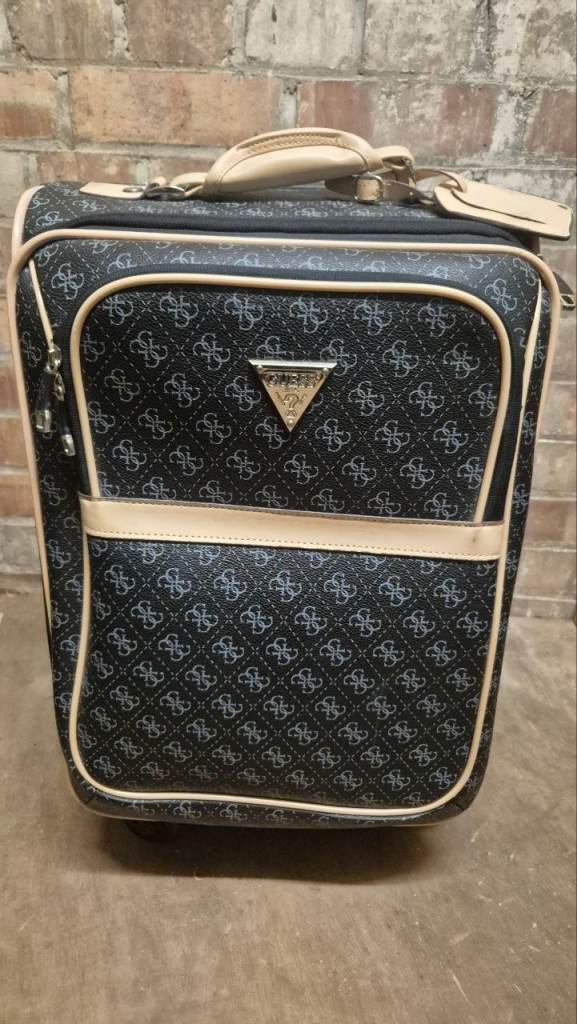 This is a Guess rolling carry-on suitcase featuring the brand's signature all-over logo pattern in black and beige. This is a Guess rolling suitcase, from a collection such as the "Logo Affair," "Berta," or "Jesco" series, featuring their signat