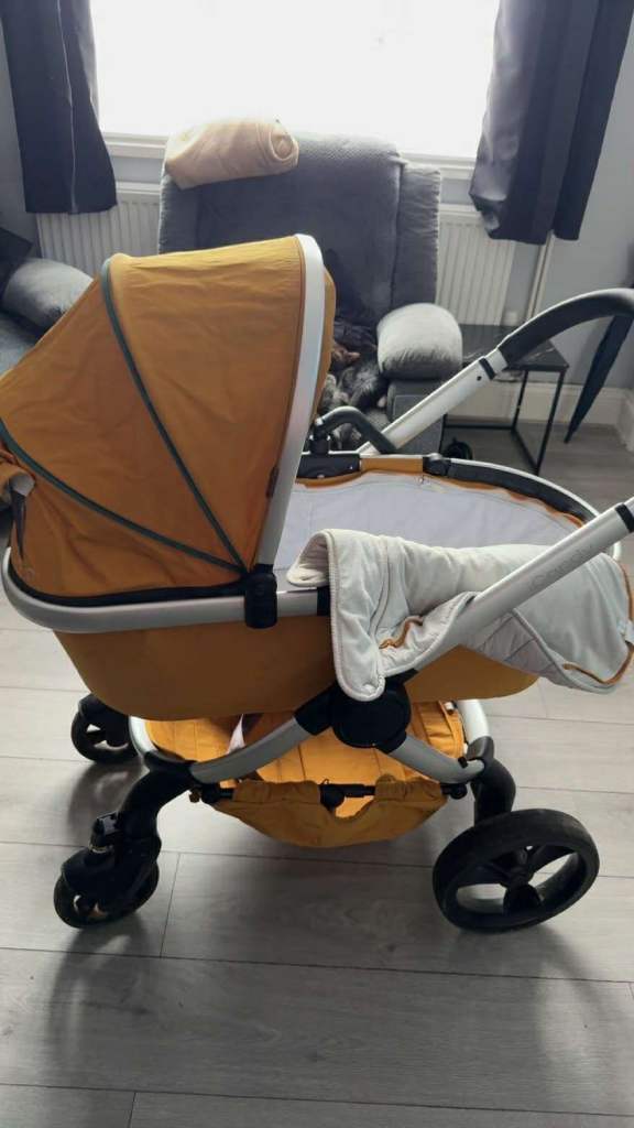 Lovely baby pram in a bright yellow colour, still in good functional condition. Comes with a carrycot attachment and a rain cover, all ready for use. There are some general signs of wear and tear, as expected from a used item. Includes the footmuff f