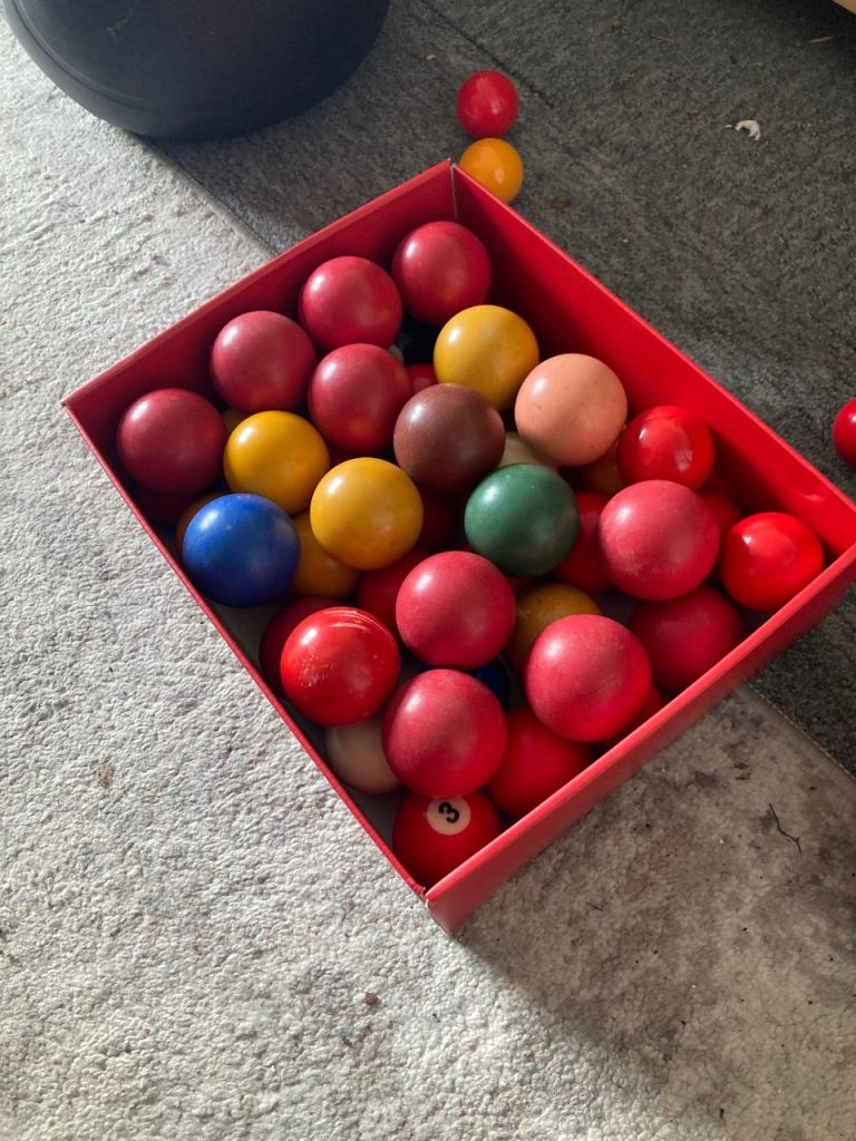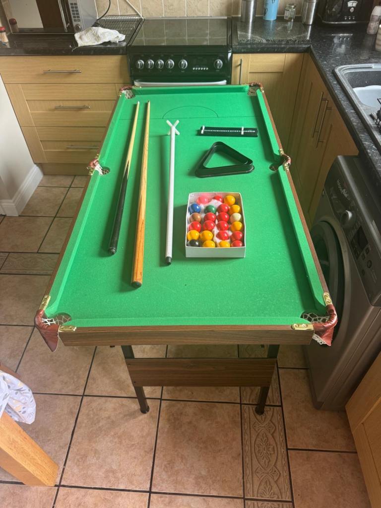 Good condition mini pool table, perfect for kids or a small space. Comes with two cues and a full set of balls, ready to play. Folds up easily for storage, handy for when not in use. Only minor cosmetic wear, felt is in good shape. Collection only