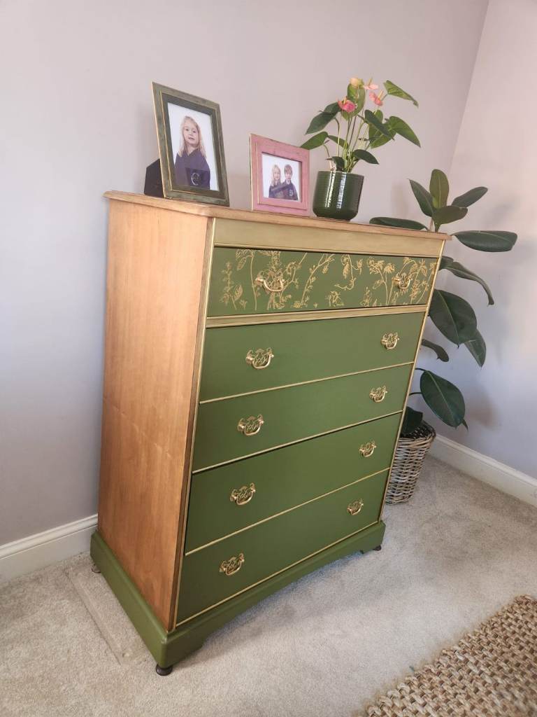 Solid set of Stag Drawers. Painted in Frenchic Moss Green. Wood varnished in dark oak. Gold detail in Dixie Belle Gold guilding wax. Decorative gold bird pattern on top drawer. Original handles. Finished in Rusoleum Furniture wax. This is piece is s