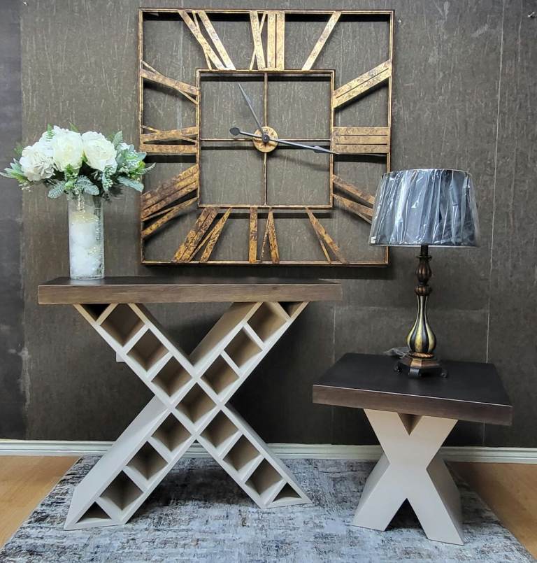 Ex-Display Console Wine Rack And Matching Lamp/Side Table For Sale Ex-Display Console Wine Rack Lamp/Side Table Chunky Top Cream Base Side Table Size: W: 605 x D: 605 x H: 500 Console Table Wine Rack Size L: 1225 x D: 400 x H: 840