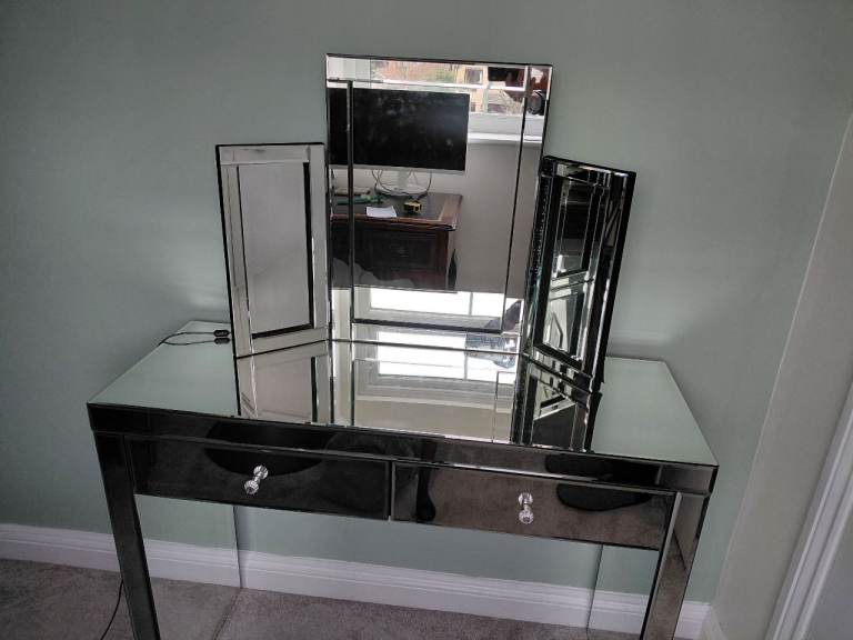 Glass and wood vanity dresser with detachable light up mirror. Two drawers. In very good condition. Ideal for hair and make up. Dimensions of dresser: Height: 75cm Widith: 100cm Depth: 37cm Dimensions of mirror: Height: 54cm Width fully ex