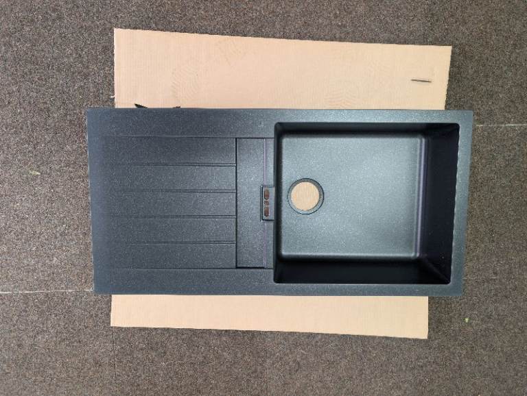 Here is an unused black composite Quartz Sink for sale, by Cooke & Lewis. This is £240 new. It has no fixtures or plumbing kit. However when it was delivered the delivery company had damaged it at the corner. See the photos. Other than that