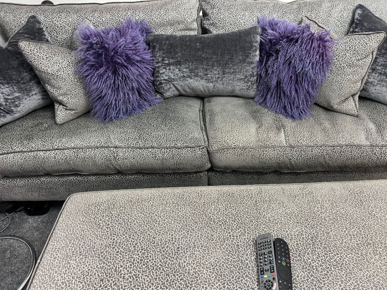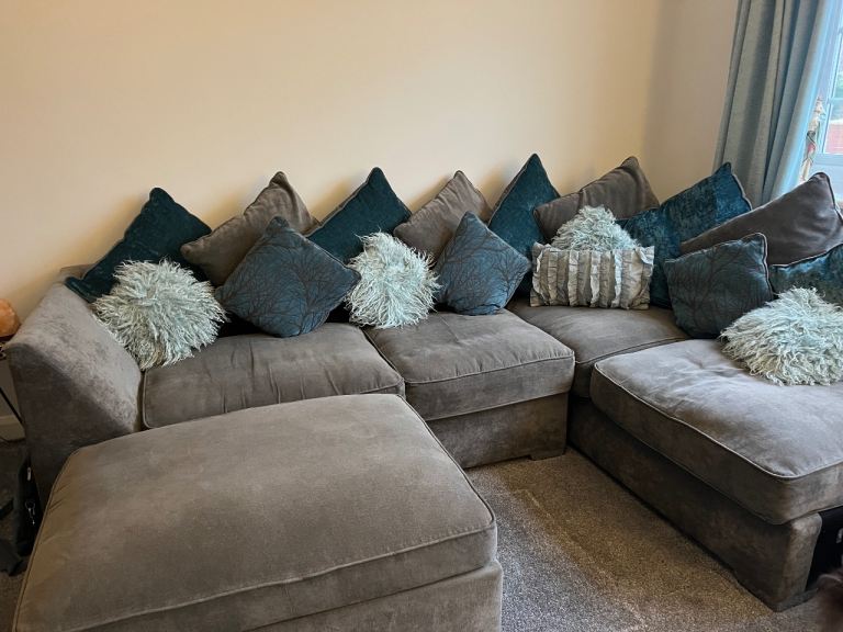 Large grey corner sofa with matching oversized footstool for sale. Includes all cushions shown in the photos. Plenty of seating and a deep, comfy sit. Included • Corner sofa • Footstool • 9 large cushions • 3 small cushions • 4 Mongolian fur