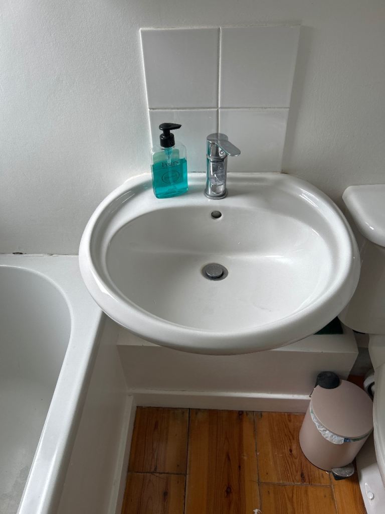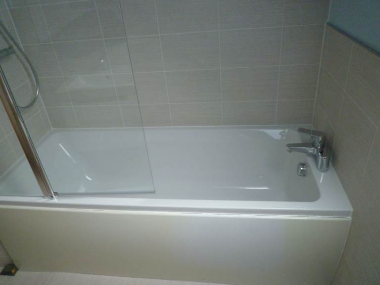Laing's of Inverurie bathroom suite, comprising: BATH: Compact Rectangular, white, with fitted ‘hansgrohe’ mixer taps and integrated waste water disposal. L x W x H 1700 mm x 700mm x 500mm (Price New: Bath £400. Hansgrohe Single Lever Mixer Taps £15