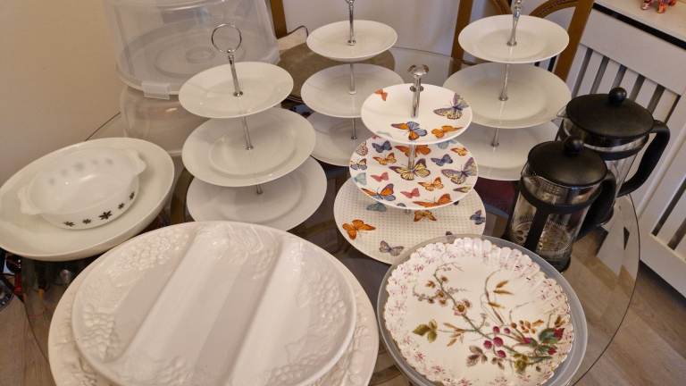 Comprising of 4 x Three Tier Cake Stand (all complete and undamaged), 2 x large Cake Transit/Storage Containers, 2 x Large Serving Plates, 1 x Decorative Serving Plate, 2 x Food Covers and 2 x Cafetierre. Selling as a complete lot ONLY.