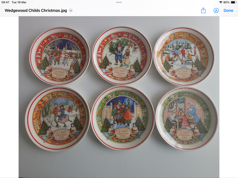 6 Wedgewood Christmas Plates. Lovely wall display plates. 1979-1984. As new condition.