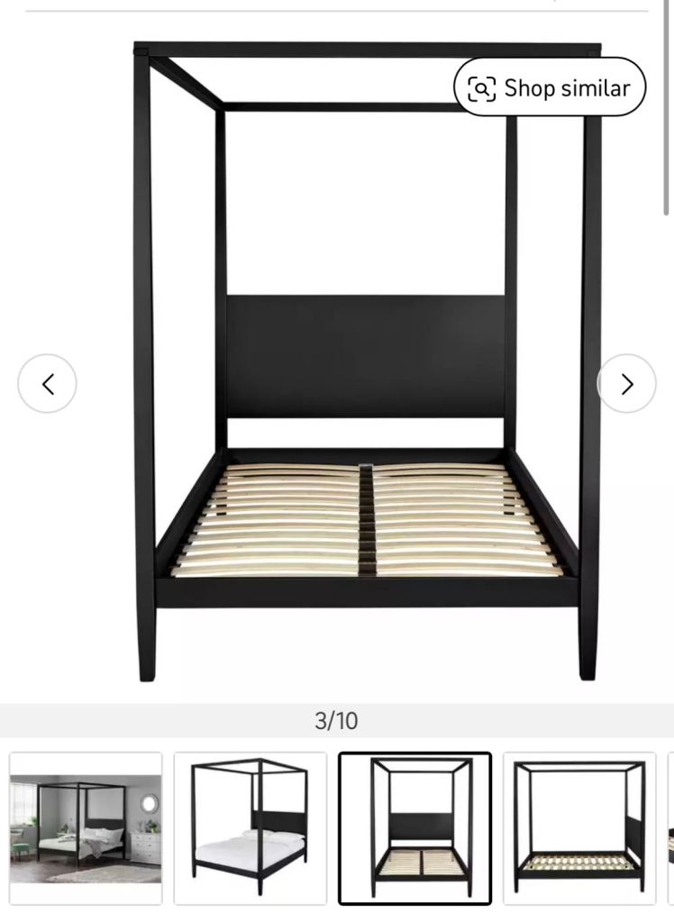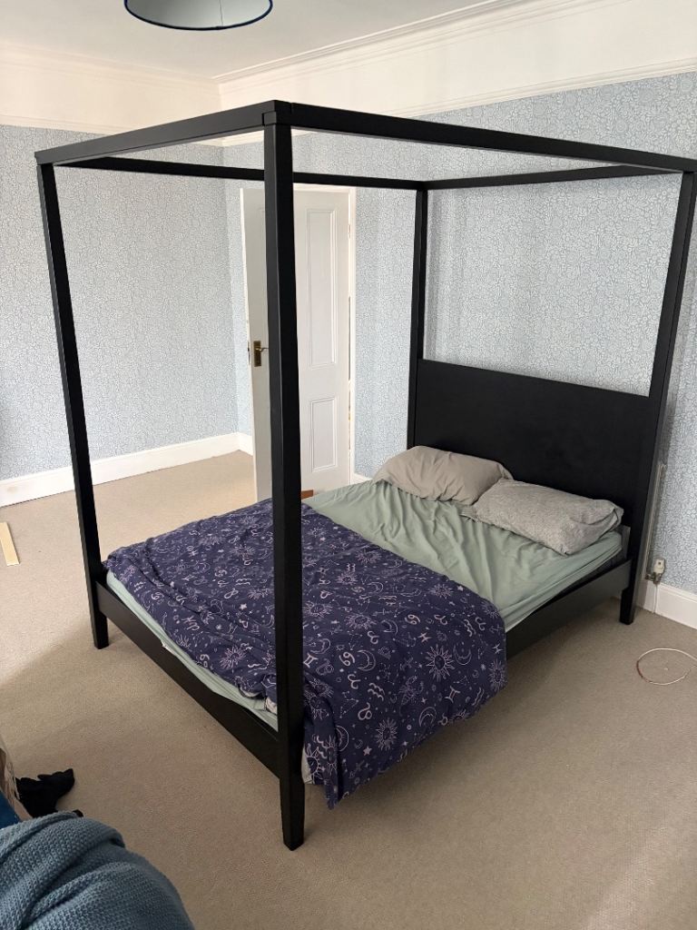 Black metal four poster Habitat bed frame without mattress. Some wooden slats missing. Buyer collects from Barry