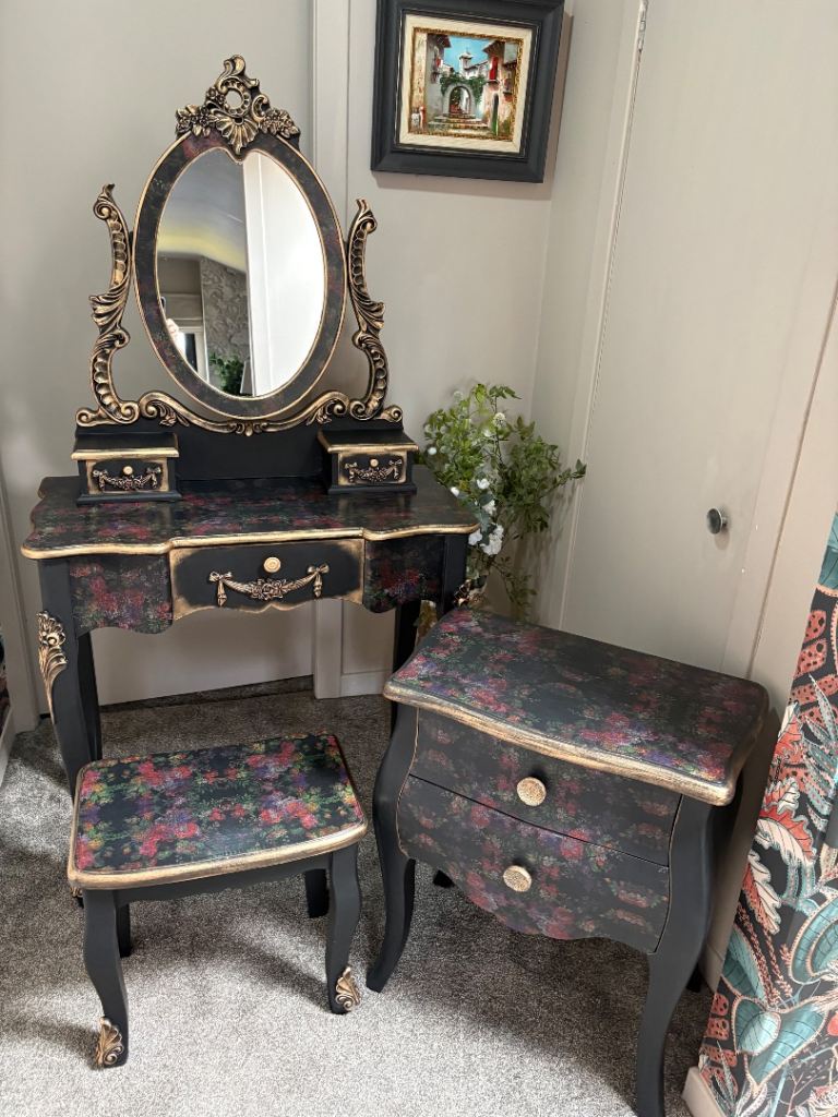 Bespoke French vintage style dressing table with mirror stool and stool and bedside cabinet. Black with decoupage detail , finished in gold guild
