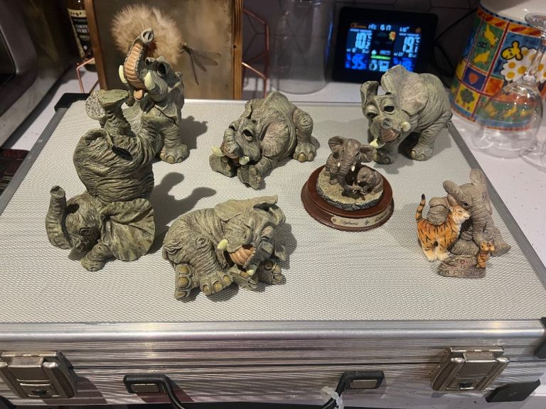 A collection of elephant ornaments, 1 tuskers and leonardo. Buyer to collect , no boxes.