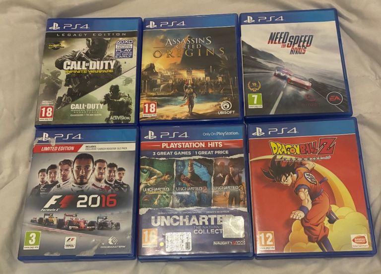 Barely used, no scratches, no damage and all of them work. If you want to only buy some of the games here are the individual game prices: - call of duty £5 - assassin creed origins £7 - F1 2016 £6 - need for speed £5 - uncharted collection £7