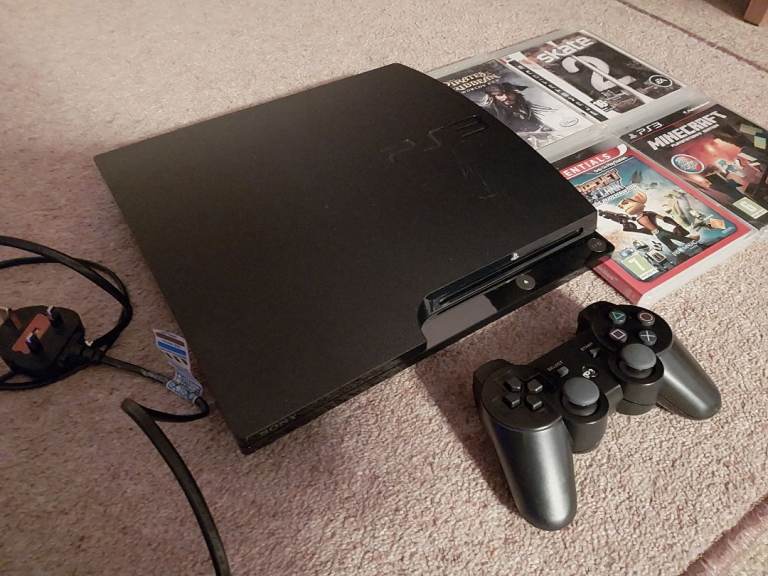 PlayStation 3 Slim with games, controller and power supply. 160GB. Minecraft, Ratchet Clank, Skate 2, Pirates of Caribbean. Photographed console working on TV. 4.90 Software. Collection Norwich NR2.