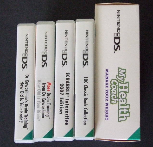 Nintendo DS Boxed with documentation Brain Training More Brain Training Scrabble 100 Classic Book Collection My Health Coach Nintendo DS Cartridge only, no case or documentation Polarium Mariocart DS These games are listed as free be