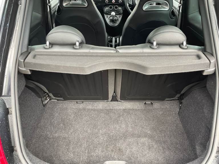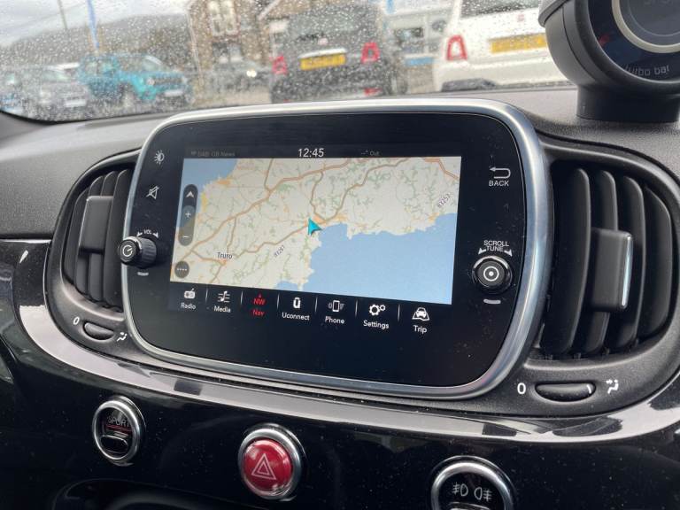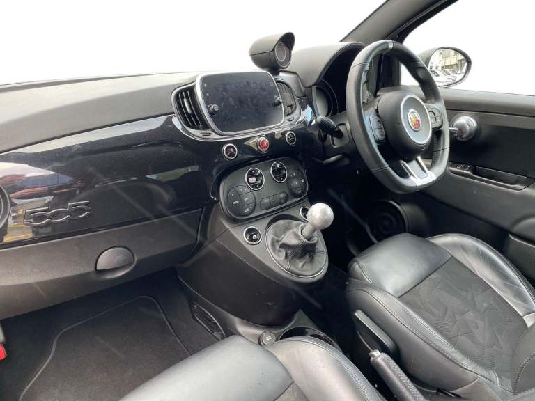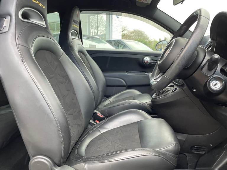 ..7'' TFT instrument display with sports mode, 7'' Touchscreen radio with 3D navigation, bluetooth, USB and DAB, Apple car play/Android Auto, Dualdrive PAS, Rear parking sensors, Sports button, Trip computer, U-connect access via mobile, Uconnect live service, Front Mac-Phersonsuspension with anti roll-bar, Front telescopic shock absorbers with Frequency Selective Damping (FSD), Koni rear suspension, Torque transfer control (TTC), Hifi by beats audio system, Abarth chromed rear twin exhaust, ABARTH side sticker, Black door mirrors, Body coloured bumpers, Chequered roof sticker, Dark tinted rear windows, Dusk and rain sensors, Electric front windows, Front bumper with honeycomb grille and embossed Abarth logo, Front fog lights, LED daytime running lights, Metallic paint with golden livery, Poly elliptical headlights, Rear wiper, Window integrated aerial with aluminium roof cap, 12V socket, Abarth sport seats, Alutex gearknob, Alutex sports pedals, Automatic dual zone climate control, Floor mats, Front head restraints, Front passenger seat memory, Glovebox, Height adjustable steering wheel, High performance BMC air filter, Interior stowage net, Italian tricolore embroidered driver and passenger headrests, Leather upholstery with fabric inserts and scorpion embroidery, Rear headrests, Scorpioneoro embroidered driver and passenger headrests, Scorpioneorologo embroidered on passenger and driver seat, Specific interior plaque of authenticity, Sports leather multifunction steering wheel with controls and satin chrome detailing, ABS, Drilled and ventilated front brake discs, Driver and passenger airbags, Drivers knee airbag, ESP + ASR/MSR + HBA + Hill holder, Front side airbags, High performance perforated brakes, Rear brake discs, Tyre pressure monitoring system, Window airbags, Alarm, Central locking, Immobiliser, Remote central locking, Black dashboard with gold finish, Gold 500 logo on dashboard, 17'' Formula alloy wheels with gold finish, Fix and go kit