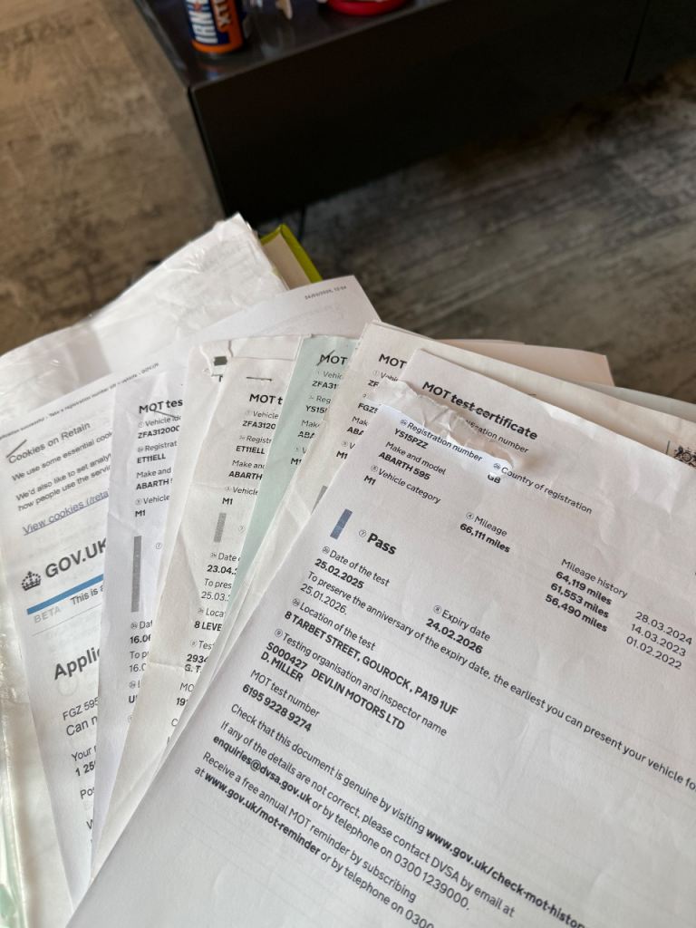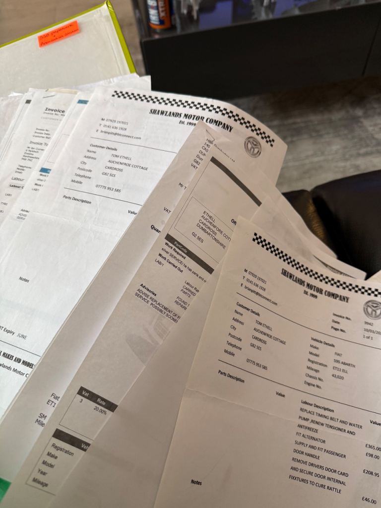 Every single bit of paper work for work done to the car, services, repairs, tyres.