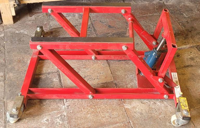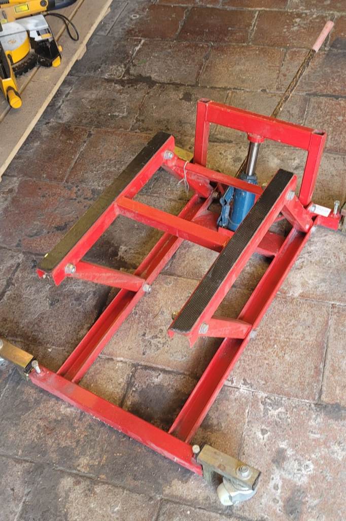 Hydralic motorcycle lift. Lift uses a bottle jack and has lifted a Pan European no problems. Great for working on lower parts of the bike with ease or moving the bike around a garage.